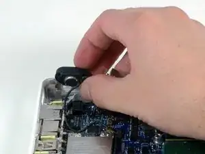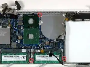 Поднимите логическую плату с правой стороны и сдвиньте её вверх и наружу из компьютера. Будьте осторожны, чтобы правый динамик, плата MagSafe и разъём батареи не зацепились за нижнюю часть корпуса.