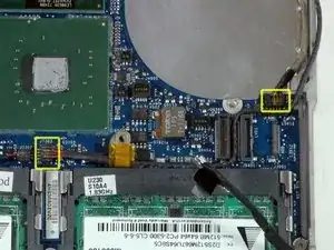 Отключите два антенных кабеля от карты Airport и чёрный кабель инвертора от платы логики. (Тяните вертикально за все три.)