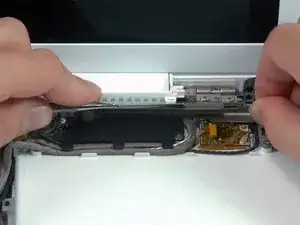 С помощью лопатки аккуратно подденьте белый пластиковый направляющий паз и сдвиньте металлический С-образный канал вправо и от дисплея.