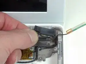 Поднимите чёрный кабель правого динамика одной рукой и отведите серебристый кабель микрофона от серебристого металлического зажима прямо над правым слотом ОЗУ.