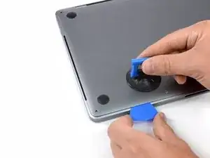Прикрепите присоску к нижней крышке в районе переднего центра MacBook Pro.