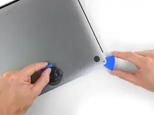 Проведите открывающим инструментом вокруг ближайшего угла, а затем наполовину вверх по боковой стороне MacBook Pro.