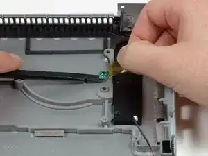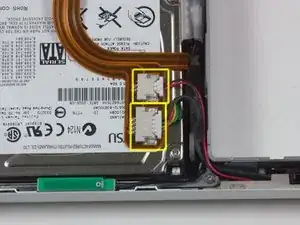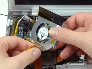 Удерживайте плату логики одной рукой и другой рукой поднимите левый вентилятор из его посадочного места. На вентиляторе есть кусок черной ленты, прикрепляющей его к радиатору. Аккуратно отлейте эту ленту от радиатора, поднимая вентилятор.
