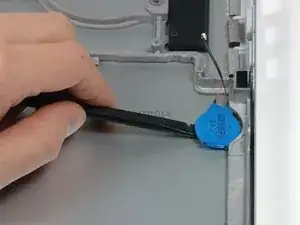 Используйте лопаточку, чтобы поддеть батарейку PRAM и извлечь её из нижнего корпуса.