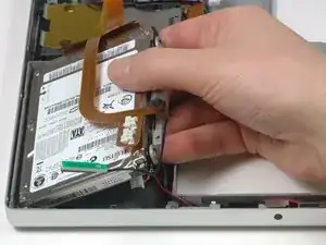 Удалите два серебряных винта Phillips, фиксирующих кронштейн крепления жесткого диска к нижнему корпусу.