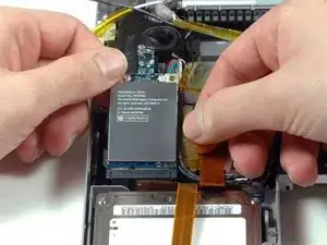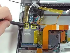 Отлейте оранжевую ленту, фиксирующую разъем аккумулятора к нижнему корпусу.