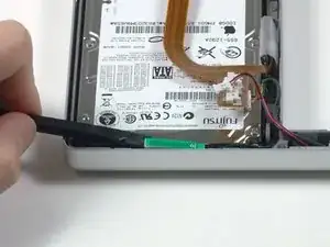 Используйте лопаточку, чтобы поддеть антенну Bluetooth от её посадочного места перед жестким диском.