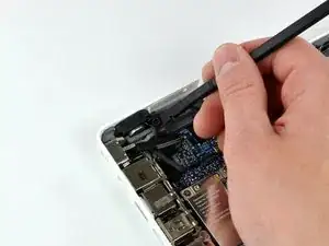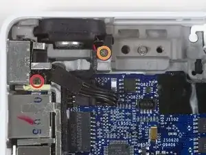 Левой рукой отведите кабель платы MagSafe в сторону, чтобы оголить винт в верхней части левой рамки портов ввода/вывода.