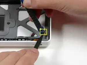 Осторожно приподнимите разъём жёсткого диска из корпуса слегка и переверните его, чтобы открыть разъём ленточного кабеля ИК-датчика под ним. С помощью лопаточки подденьте маленький фиксатор, удерживающий конец кабеля на месте.