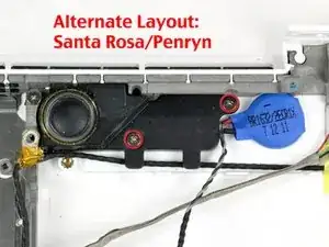 Обратите внимание, что для серии не‑Unibody MacBook Core Duo/Core 2 Duo существуют три различных, несовместимых нижних панели: для оригинальных моделей, для моделей Santa Rosa/Penryn и для моделей начала/середины 2009 года. Они несовместимы из‑за разных расположений опорных стоек крепления винтов для разных радиаторов, сабвуфера и правого крепления петли.