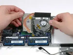Держите радиатор одной рукой и вентилятор другой, и выньте сборку радиатора с вентилятором из компьютера. Вентилятор прикреплён к радиатору только полоской чёрной фетровой ленты, поэтому вынимайте обе части вместе как единое целое.