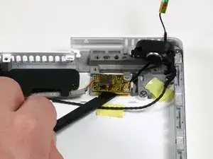 Используйте лопаточку, чтобы приподнять левый динамик из посадочного места. Схватите его пальцами и отложите в сторону.