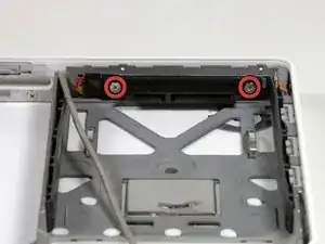 Снимите два винта Phillips с каждой стороны правой стенки отсека для батареи (не те, что ближе всего к разъёму батареи).