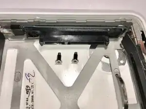 Удалите два прижимных винта Phillips 6 мм с фланцем, крепящие разъём жёсткого диска к нижнему корпусу.