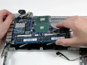 Поднимите логическую плату за её правую сторону, сдвиньте её немного вправо, затем вверх и извлеките из нижнего корпуса. Если порты ввода/вывода не освобождаются легко с левой стороны корпуса, осторожно приподнимите нижний левый угол логической платы, потянув за кабель разъёма батареи.