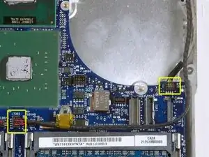 На некоторых моделях Santa Rosa/Penryn также требуется отсоединить разъём батареи PRAM. См. второе изображение.