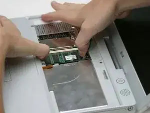 Одновременно освободите язычки с каждой стороны чипа оперативной памяти. Эти язычки фиксируют чип на месте, и