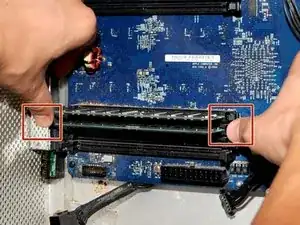 Используйте большие пальцы, чтобы нажать на фиксирующие штырьки оперативной памяти по бокам.