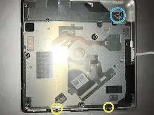 Удалите винты, удерживающие оптический привод в верхней части корпуса