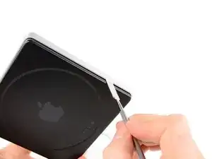 Вставьте металлическую лопатку между чёрной нижней крышкой и алюминиевой верхней крышкой.