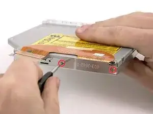Удалите два винта с крестообразным шлицем, фиксирующие металлический кронштейн и кабель на задней стороне оптического привода.