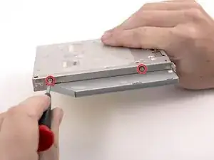 Держите оптический привод на боку и прижмите оставшуюся защёлку, чтобы освободить безель от привода.
