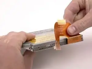 Отклейте оранжевый кабель от верхней поверхности оптического привода, при необходимости удаляя ленту, и отсоедините его.