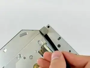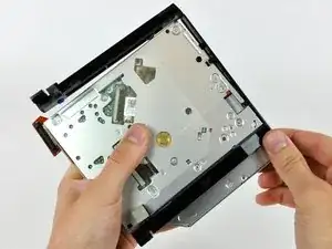 Аккуратно извлеките оптический привод из задней части корпуса, соблюдая осторожность с двумя пластиковыми штырьками, встроенными в заднюю часть корпуса возле открытого конца привода, которые могут сломаться.