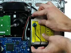 Вытяните оптический привод от боковой стороны задней панели и удалите его из iMac.