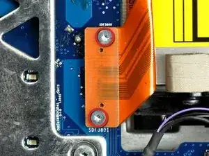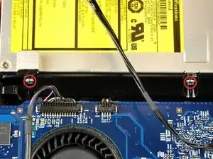 Удалите два винта Torx T6 длиной 3.6 мм, фиксирующих разъем шлейфа оптического привода на плате.