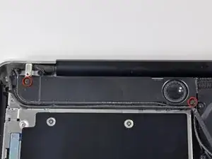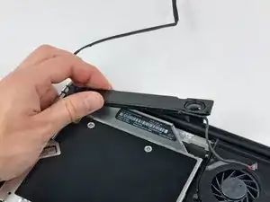 Используя плоский конец лопатки, осторожно подденьте разъём кабеля правого динамика/сабвуфера прямо вверх, чтобы отсоединить его от логической платы. Будьте осторожны, чтобы не оторвать гнездо. Потяните разъём в сторону оптического привода.