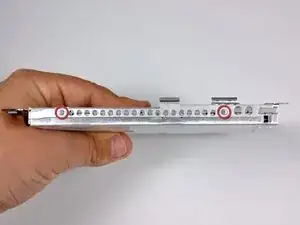 Совет при сборке: Две центральные защёлки над DVD-отсеком редко защёлкиваются обратно без помощи; простое надавливание сверху может деформировать рамку вокруг отсека. Поддержите рамку, вставив пластиковую лопатку в слот DVD непосредственно под местом защёлки, пока она не упрётся, затем нажмите вниз до щелчка.