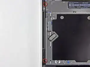 Удалите два винта с крестовой головкой 2.5 мм, крепящие оптический привод к верхней крышке рядом с отверстием для оптического привода.