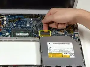Отключите оранжевый шлейф SuperDrive от логической платы, при необходимости удалив ленту.