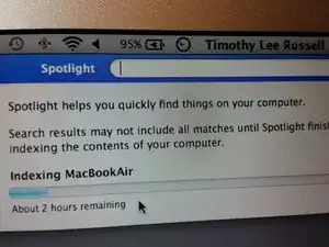 По какой-то причине при клонировании индекс удаляется, поэтому Spotlight будет какое-то время заново индексировать содержимое.