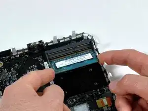 Одновременно оттяните язычки по обеим сторонам модуля ОЗУ от центра модуля. Эти защёлки фиксируют модуль на месте; при их отпускании модуль «вскакивает» вверх.