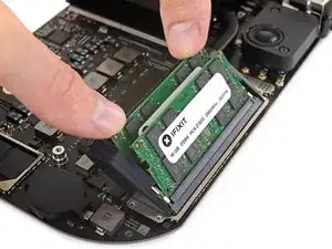 Наконец, прижмите верхний край каждого модуля ОЗУ, чтобы опустить его к плате, пока фиксирующие защёлки по обеим сторонам не защёлкнутся.