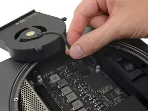 Не пытайтесь полностью снять вентилятор на этом шаге — просто приподнимите его, чтобы получить доступ к кабелю под ним.