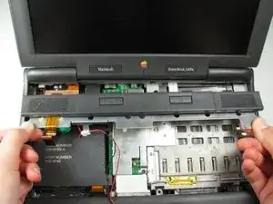 Ослабьте лентовые кабели, соединяющие клавиатуру с компьютером, с помощью пластикового инструмента для вскрытия, приподняв защёлки по обеим сторонам разъёма кабеля.