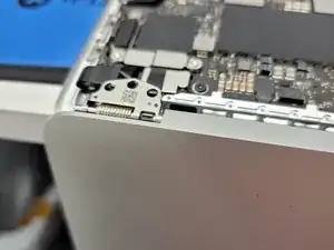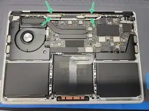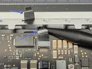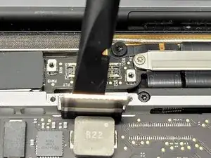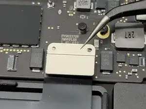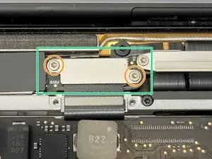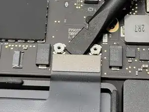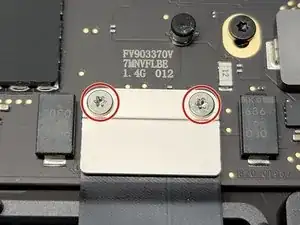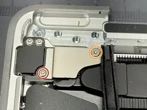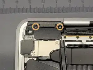 Удалите 2× 1.8 мм винта Torx T3, крепящих верхнюю крышку пластины к MacBook