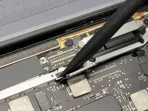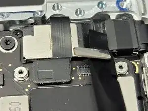 Другой рукой возьмите крючок спуджера Halberd и аккуратно подденьте удерживающую защёлку ZIF-разъёма кабеля батареи