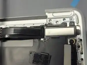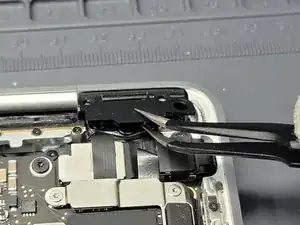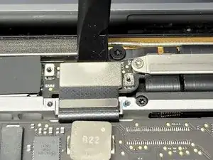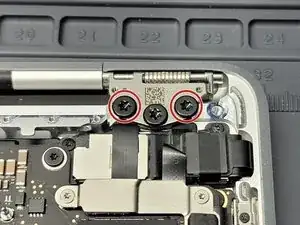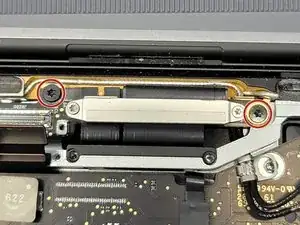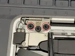 Снимите 2× 2 мм винта Torx T3, фиксирующих крышку петли к корпусу MacBook