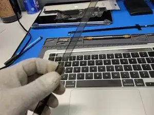 Метод 1: Возьмите 2 пинцета или держателя и обмотайте тонкой проволокой их концы. Затем протяните проволоку под ЖК‑панель Touch Bar, аккуратно подтягивая её, стараясь не повредить клавиатуру