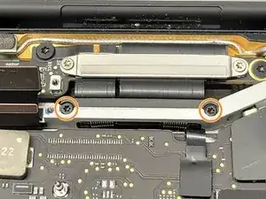 Найдите и удалите оставшиеся 2× 4.5 мм винта Torx T9, крепящие оба шарнира к MacBook