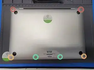 Снимите 2× 3.2 мм винта Torx T3, фиксирующих нижнюю пластину к MacBook