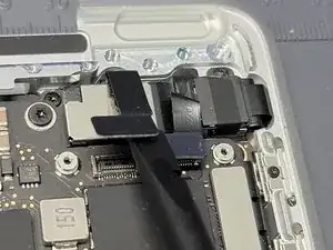 Возьмите плоский конец лопатки и аккуратно подденьте все 3 гибких кабеля в их разъемах