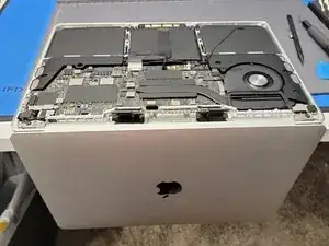 Пока не пытайтесь полностью снять заднюю крышку. Она всё ещё соединена с MacBook