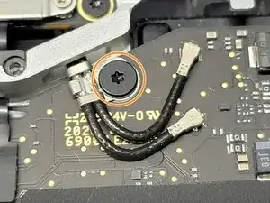 Удалите 1× 3.9 мм винт Torx T5, крепящий антенные кабели к MacBook
