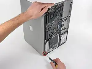 Используйте наконечник лопатки, чтобы отогнуть край наклейки «Warning: Do not remove the battery», пока вы удаляете третий скрытый под ней винт Pentalobe с пятью лучами.