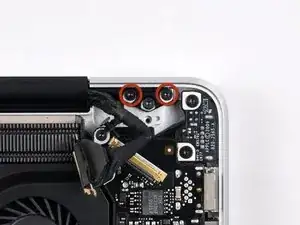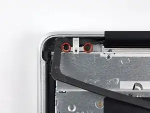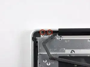 Удалите внешние два винта Torx T6, фиксирующие оба шарнира дисплея к верхней части корпуса (всего четыре винта).